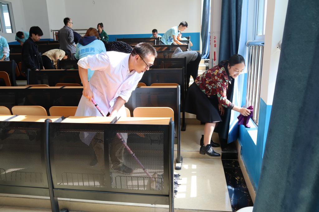 11月7日上午,我校医学院“不忘初心,牢记使命”主题教育“清扫实验室、阶梯教室”党员志愿服务活动在医学实验中心大楼举行。院党委书记张勤、副书记陈恺、学生科科长任娟、教工党支部书记周建平、学生党支部书记黄馨瑶、副书记罗涛及师生党员、预备党员、入党积极分子参加了活动。