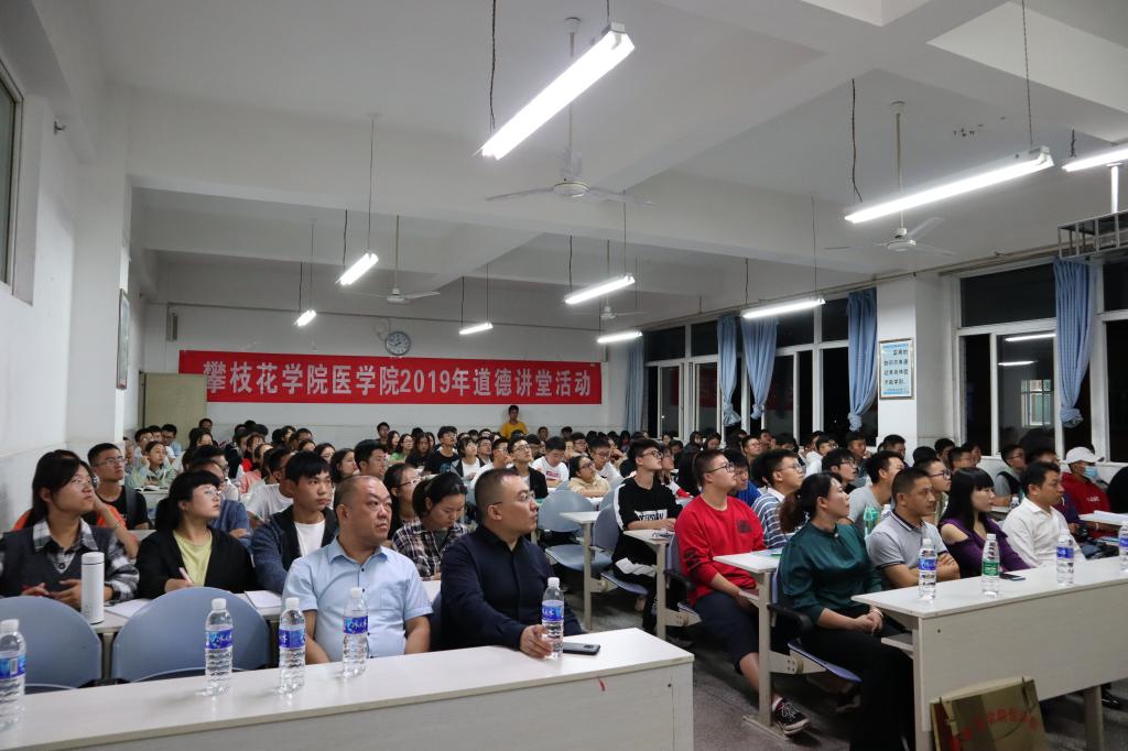 本次活动邀请了我校校友——攀枝花市东区银江镇卫生院党支部书记、院长胡太卫为同学们做专题讲座。胡太卫以“守初心记使命 勇担当——做一名新时代合格的白衣天使”为题,为同学们讲述了一名基层医生的初心和使命,讲解了基层医疗卫生单位对人才的需求及目前基层医疗发展现状和存在的机遇,并结合个人成长经历,勉励同学们用科学的方法学好医学专业知识,掌握精准的专业技能,努力培养高尚医德和仁爱之心,立志为民族复兴大业,为服务人民群众健康贡献力量。随后,医学院党委书记张勤对本场“道德讲堂”活动进行点评。